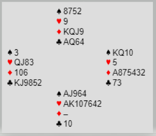 Jeg (øst) spilte ut hjerter dame mot nords 3NT. Nord hadde åpnet med 1NT så den lange ruterfargen var skjult.