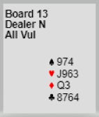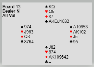 Om vest burde lagt svakhet, eller om øst muligens kunne unngått å spille liten hjerter i andre stikk kan kanskje diskuteres (?). Men ved det andre bordet la i alle fall vest hjerter 6. Øst fortsatte med hjerter konge, og siden damen falt tok forsvaret raskt fire hjerterstikk og spar ess, en bet. Spillet ga 13 IMP til Bergen AK.