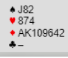 Alt dette er i teorien irrellevant denne gangen, og spillet ble ikke avgjort i første stikk. Spillefører har kun det ene hjerterstikket, seks ruterstikk og og kløver ess = 8, altså en bet. Men så er det det med å være våken, og kanskje var det ikke så enkelt heller for vest da det i andre stikk ble spilt liten ruter til damen og liten spar fra syd. Husk vest ser ikke nords kort, og vet ikke om den lange ruterfargen. Vest har jo kontroll på kløveren også. Da vest la liten spar sa spillefører "ja, takk", han fikk "stjålet" seg ett sparstikk og forlangte raskt alle ruterstikkene og kløver ess - ni stikk totalt og vunnet utgang. Det ga 82% til N/S, mens om vest hadde føket opp med spar ess og spilt hjerter ess og mer hjerter ville det blitt en bet og 75% til Ø/V i stedet for usle 18%