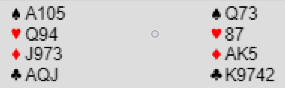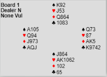 Etter pass fra nord åpnet øst med 1 kløver. Syd meldte inn 1 hjerter, og vest (ved begge bord) sa 1 spar som benektet sparfarge (de dobler med minst fire spar). Nord meldte 2 hjerter, og etter pass-pass sa vest 3NT.