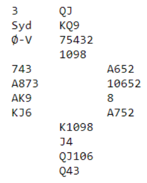 Jan sån jo at makker måtte ha noe å nfare med og selv dekket han ngodt for ethvert utspill- angrep. Derfor kom 4b NT, vanlig Blackwood og Lise som jo ikke kunne ha noe ess svarte 5 kløver. Nå spratt Jan P. direkte til 6 NTuten med 5 NT å fortelle om at alle fire essene var på plass. Men det var vellykket siden ru K kom deisende på fra Vest da han i 2. stikk etter hj 8 ut til kongern trakk fralangfargen i bordet. 13 stikk sto jo nå fra taket for ren topp. Ingen andre meldte slem.