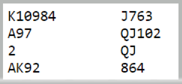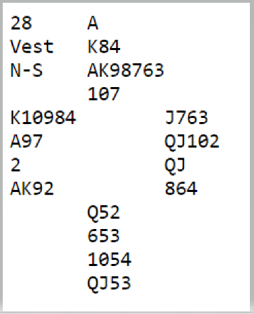 Her sprengte Ø/V for Norge U-56 kortene fullstendig, og det måtte til for å komme på papiret i den korte kampen. Aaseng (vest) skulle spille 4 spar etter at nord hadde meldt inn 2 ruter.