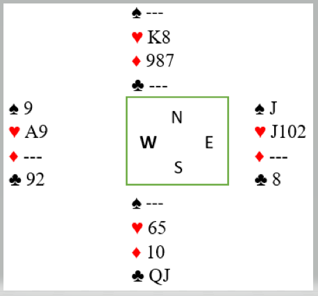Nå ble hjerter ess og mer hjerter spilt. Nord ble innspilt for andre gang, nå med kun ruter igjen. Og ruter fra nord til dobbeltrenons ga avkast for kløver 8 idet vest kunne trumfe - ti stikk.