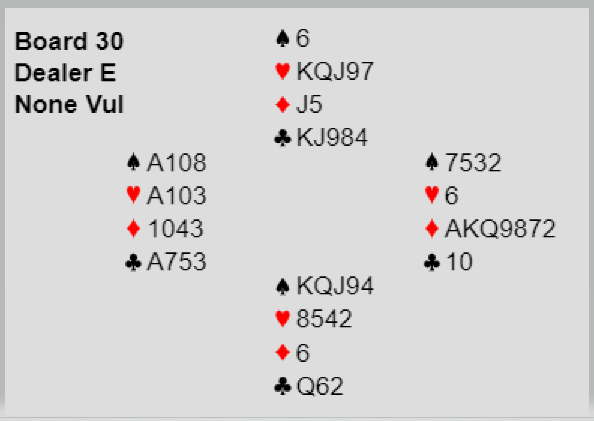 Og det ble altså en bet, i et spill som ikke vil bli så lett å glemme for det norske paret da man kan si det ble nokså avgjørende for kamputfallet. Ved det andre bordet ble det også meldt 7 hjerter, men der spilte syd ut ruter. Da var spillet kjapt over, tretten stikk på mindre enn tretten sekunder. En bet ved de ene bordet pluss vunnet storeslem ved det andre er verd 17 IMP selv om det er utenfor sonen.