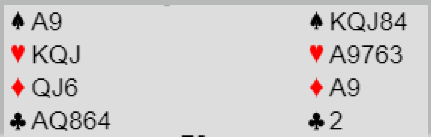 Du og jeg som ser alle kortene ser raskt at kan 7 hjerter vinnes ved enten å ta ruterfinesse, eller trumfe en kløver og se at kongen kommer på. Det er imidlertid noe helt annet ved bordet...