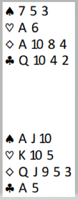 Ved det ene bordet i denne lagkampen tenkte ikke syd sånn og bare satte i gang. På den utspilte hjerterdamen ba han om esset, spilte kløver til esset og ruter dame som fikk seile. Men øst hadde ruter konge og spilte hjerter gjennom syds K-10. Spillefører la tieren, vest vant med damen og spilte hjerter 9 til kongen (øst fulgte farge). Nå var det kun åtte stikk, og vests hjerter var godspilt. Spillefører forsøkte liten kløver mot Q-10 og la tieren idet vest la liten. Hvis knekten hadde vært hos vest og kongen hos øst ville damen bli godstpilt og gitt det niende stikket. Men øst stakk med kløver knekt og spilte liten spar. Spillefører trodde vest hadde en sparhonnør og valgte å gå opp med esset for å begrense nederlaget - en bet. Hele spillet så slik ut: