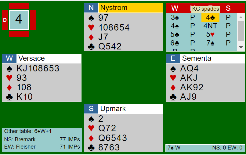 I skrivende stund pågår runde 6 av 16 kvalifiseringskamper i lagturneringene i Strasbourg. Akkurat nå har lederlaget SCORWAY tatt en fin ledelse i sin kamp mot PATCHWORK DYNAMITE. Kampen overføres på BBO.