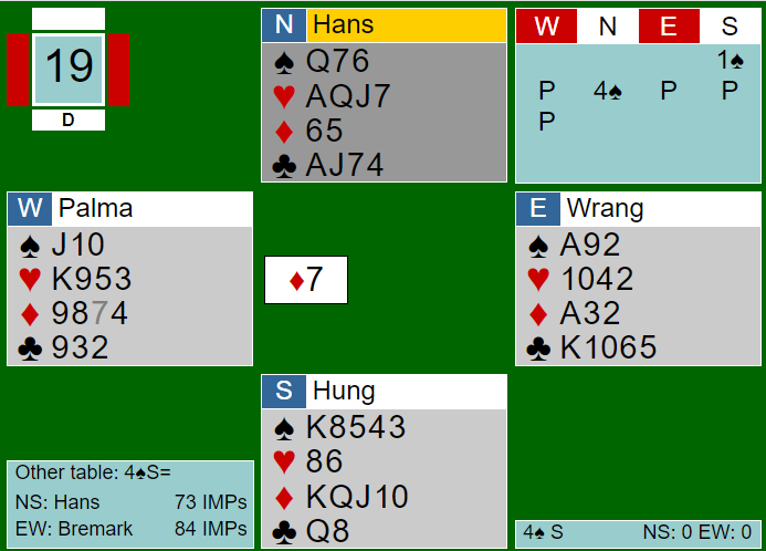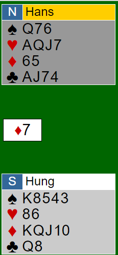 Problemet er at han ikke kan få spilt seg over og tatt nok en trumffinesse siden det i så fall ikke blir igjen noe inntak til nord. Grude spilte med oddsen da han spilte på 3-1 i trumf og satte i gang med ruteren. Det ville gått galt om trumfen hadde vært fordelt 2-2 (vest kunne da trumfet i tredje ruterrunde). Grude gikk altså på ruteren og fikk kastet både en hjerter og den siste kløveren på ruter før han kunne ta en trumffinesse til (eller bare presse med ruter), tolv stikk.