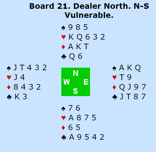 Med litt forsiktig pass i stedet for å melde 3 ruter fra Vest fikk da Kjennbakken vist sin langfarge og da det deretter gikk pass rundt var det etterpå enkelt for Nord å snelle inn 9 stikk som ga dem topp med 110 inn. Ø-V kunne fightet i ruter og den kontrakten ville gitt 10 stikk! Thor påpeker at han selv høyst kan ha dobbelton i spar, for med 3- kort kan han doble for å vise det hvis Torfinn over 2 ruter hadde passet.