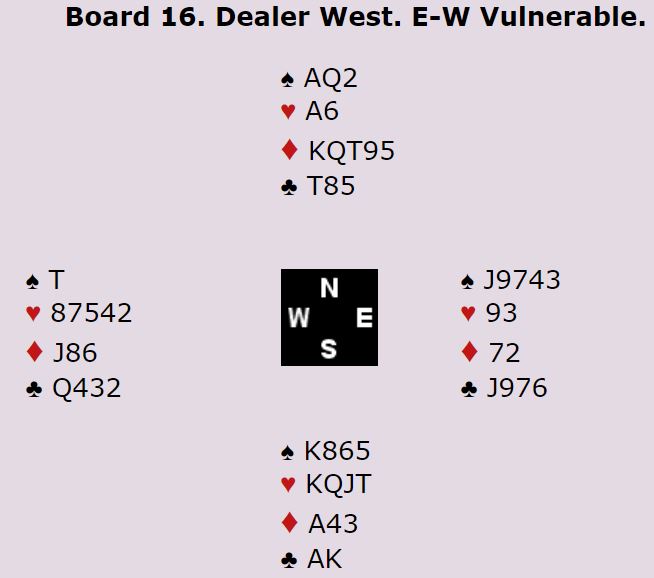 Det ble bare to ruterstikk og ett stikk i kløver til de amerkanske motspillerne, og NORGE noterte + 630 for ett overstikk i 3NT. Ved det andre bordet må den amerikanske syd fått helt panikk og oversett totalt poenget med å lasjere ruteren. Dermed gikk det helt galt, og da røyken hadde lagt seg hadde det norske Ø/V-paret fått tak i tre sonebet! Spillet ga 14 IMP til Norge.