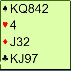 Ved det andre bordet passet syd i tredje hånd. Da fikk Marianne Harding (vest) åpnet med en vanlig 2NT. Chrstian Bakke (øst) spurte om femkorts major da 4 hjerter godt kunne vært beste utgang, men da vest ikke hadde fem hjerter ble kontrakten 3NT. Mot den ville spar ut vært truende, og det var jo en av tankene bak 1 sparåpningen som ble valgt ved det andre bordet. Men selv med spar ut vinnes 3NT med 1+2+4+2 stikk, en vellyket kløverfinesse ordner saken. Nord hadde ingen grunn til å spille ut noe annet enn liten hjerter. Den gikk til spilleførers syver, og nå hadde hun ni sikre med kun ett i kløver, men hun visste jo ikke enda helt sikkert at ruteren ga fire stikk. Men nå hadde Harding tid til å spille kløveren best mulig for ekstra stikk, esset først. Hvis kongen sitter foran damen sitter den det etter at esset er spilt også slik at damen vil gi stikk. Så hun tok for esset som noen ganger tar med seg kongen singel bak, så over til øst og kløver mot damen. Det ga det samme ekstra stikket i kløver som finessen ville gitt, og siden ruteren ga fire stikk ble det ti stikk og +430. Spillet ga 11 IMP til LYKKELAND.