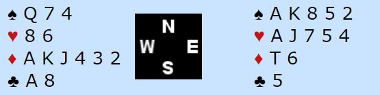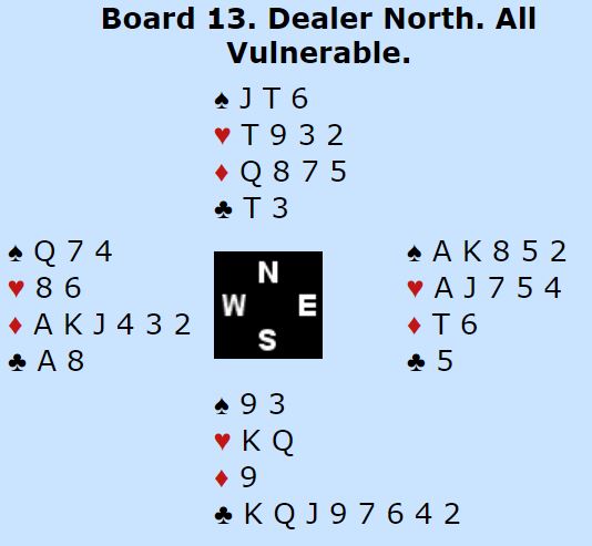 Der Christian Bakke satt øst og Marianne Harding vest startet det med 1 spar fra syd, dobler fra vest og 4 spar fra nord. Nå sa Bakke 4NT – to steder å spille – og vest valgte å vise kløveren. Hun hadde imidlertid nok til å ta sjansen på slem følte hun og sa 6 kløver. Bakke korrigerte til 6 ruter som ba vest velge mellom de to fargene, og 6 ruter ble kontrakten.