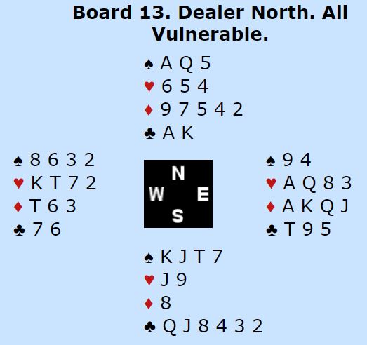 Syd spilte ved de fleste bordene ut sin single hjerter. Mange vant hjerterutspillet med damen og spilte ruter til kongen og esset. Derfra kom hjerter til stjeling, Nå er spillefører i trøbbel og fikk vanskeligheter med å både få tatt kløverfinessen som for så vidt løser den fargen enkelt, og i tillegg tatt to sparfinesser. Slik det gikk var det mange som gikk en bet, og noen gikk to bet i denne normale utgangen.