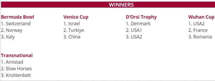 I dameklassen ser det unektelig verre ut når det gjelder å komme på pallen, men det er ikke helt umulig. Kina leder med 61 IMP mot Norge. Det blir veldig tøft, men det er lov å håpe. Jeg har selv vært med på å tape utslagskamper etter å ha ledet stort, og i ett tilfelle tapt en finale etter å ha ledet med nesten 50 IMP med fire spill igjen. Fire spill! I dag skal vårt damelag spille 16 spill.