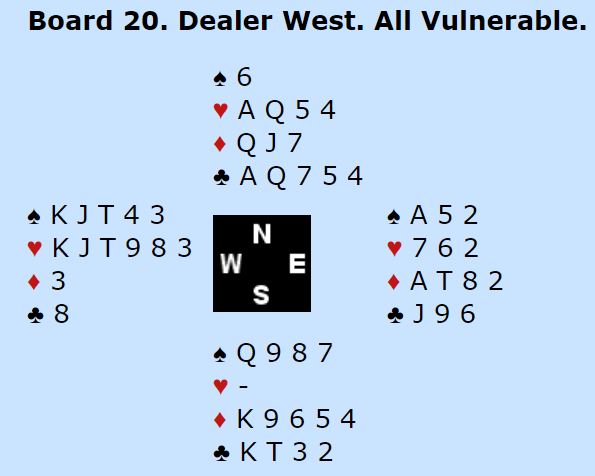 Hva som er riktig å gjøre med vest sin hånd er ikke så godt å si. Noen passer, andre åpner med 1 hjerter, mens andre igjen prøver seg med et forsøk på en strategisk 1 spar i håp om senere å kunne få vist minst 5-5 i alle fall. Jeg synes 1 hjerter i åpning er greit, men hva som blir riktig i enkeltspill med slike kort er nokså tilfeldig.