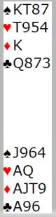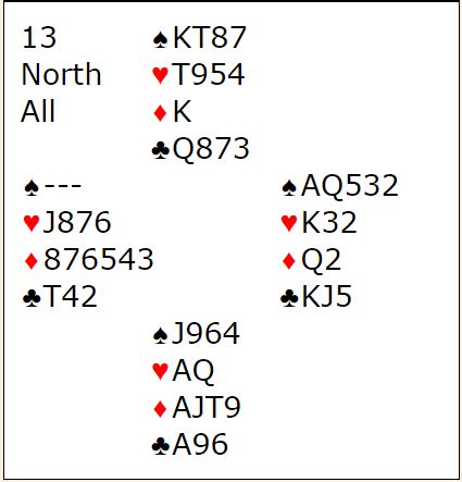N/S spiller ganske bra i minorkontrakt, antagelig litt bedre i kløverkontrakt (bedre trumfkontroll). Ø/V vil normalt spille spar- eller hjerterkontrakt hvis de får kontrakten, og de kan fort komme for høyt. For det må bli to hjertertapere og to kløvertapere, muligens ni stikk i hjerterkontrakt. I sparkontrakt blir det en spartaper også, kun åtte stikk.