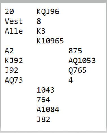 Ruter 9 gir en finessemulighet, så det bør satses på ruter 10 hos syd. Men det bør ikke spilles liten til nieren på direkten. Da kan en risikere at nord med K-10 eller A-10 dobbel vinner stikket med tieren, og da blir det tre rutertapere. Beste ruterbehandling er liten fra vest til damen, da fanger en opp en eventuell honnør-10 dobbel hos nord. Hvis ikke tieren kommer på må du legge damen og senere sette din lit til ruterfinessen med nieren. Slik så hele spillet ut: