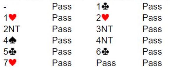 Vår (anti)helt på vests plass hadde imidlertid andre planer. Jeg tipper han var litt påvirket av den stilen som mange spillere spesielt i Australia har blitt tilhengere av, svært tynne åpningsmeldinger selv med balanserte hender. De mener den aggressiviteten lønner seg, men jeg er nokså tvilende til det. Det må da ofte bli litt vanskelig hvis man ikke vet om det er minst 12 poeng på den andre siden, eller i alle fall 11 gode poeng?