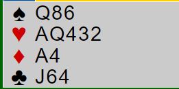 Makker melder 3NT som viser kun trekorts hjerter. Men med jevn hånd støttes sjelden med trekorts, da gjenmeldes normalt 1NT over svar 1 i majorfarge. Så hvis åpneren har en relativt jevn hånd med kun tre hjertere må han ha litt fordeling for å støtte, i alle fall en svak dobbelton for å forsvare høyningen til 2 hjerter i dette tilfellet.