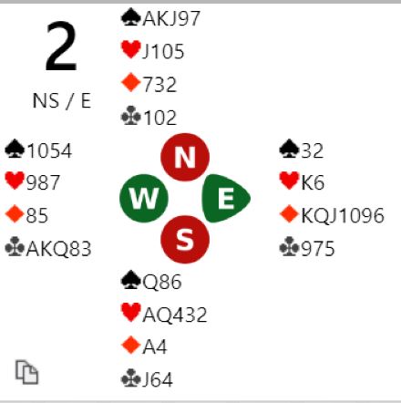 De tre andre bordene i semifinalen spilte (selvsagt?) 7NT, og laget til han med det lekre meldingsforløpet måtte tåle tapt spill med uvanlige 20 IMP (-2220 og -100).