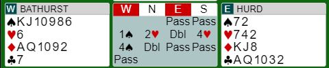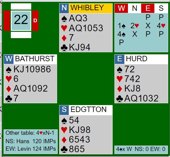Ved det andre bordet spilte Meckstroth (nord) 4 hjerter doblet. Det satt fælt, og selv Meckstroth kunne ikke få mer inn ni stikk, Ø/V +100. Dermed tapte lag LEVINE 7 IMP på spillet. Om Bathurst hadde vunnet sin 4 spar ville det blitt 13 IMP inn i stedet, 20 IMP i sving i kampen de altså tapte med 10 IMP.