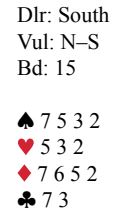 Syd åpnet med en sterk kunstig 1 kløver. En intelligent pass kom fra Engle (vest), og nord svarte 1 ruter som viste 0-7 poeng. Nå kom øst innpå med 2 ruter, og syd doblet som ble forklart som sterk og semibalansert. Da tenkte Engle det kunne være kult å delta i dette meldingsforløpet og hoppet like godt til 4 ruter! Nord doblet, og det gikk pass rundt. Slik så hele spillet ut: