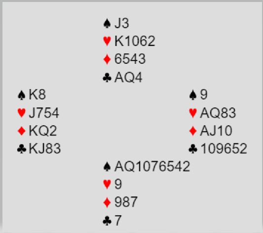 Idet syd var inne på spar ess spilte han mer spar og vest kom inn på kongen. Amerek spilte hjerter knekt. Det rullet opp hele hjerteren. Nord kan dekke, men da vinner esset og nieren faller fra syd. Så over på vests hånd og finnesse i hjerter over nords 10-6-2 gjenværende med syveren fra vest. Hvis nord dekker syveren med tieren stikker øst med damen. Så over til vest igjen, og hjerter til finesse over nords gjenværende 6-2 med østs 8-3! Bærre lekkert!
