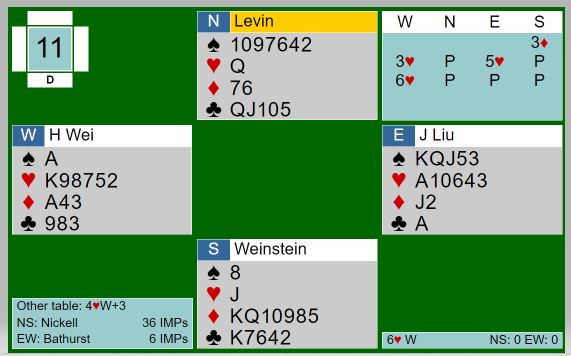 Wei-Lie fikk det egentlig verre da syd som du ser åpnet med 3 ruter mot dem. Spørsmålet blir hva de forskjellige meldingene fra øst betyr i denne situasjonen hvor makkeren har meldt inn 3 hjerter. De fleste bruker vel 3 spar og 4 kløver som naturlige meldinger over innmelding 3 hjerter. Å si 4 ruter må bety en god 4 hjertermelding, slem er mulig. Men lover den meldingen ruterkontroll?
