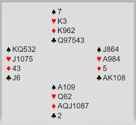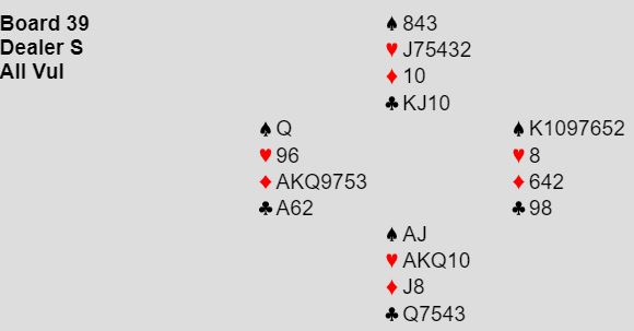 Ved det andre bordet passet vest da syd åpnet med 1NT uten at jeg vet sikkert hvorfor. Kanskje var det pga. av systemvarianter, for eksempel dobling viste noe annet enn sterke kort, og 2 ruter også noe annet enn ruter? Eller kanskje vest bare hadde et litt romantisk håp om å få spille motspill mot grandkontrakt? Det videre meldingsforløpet ble imidlertid kort: