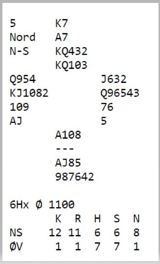 I dette spillet var det svært få som fant kløvertilpasningen. Det er kanskje ikke så lett når nord åpner med 1 ruter som naturlig melding. De fleste spilte 5 eller 6 ruter, og de som var i lilleslem i ruter gikk stort sett bet etter singelton kløver ut til esset og kløver tilbake til stjeling.