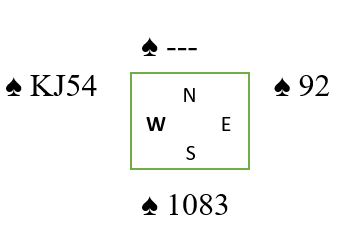 Nå kan syd dekke den første sparen fra øst, og vest vinner stikket. Så spilles kløver til øst og den siste sparen. Da legger syd liten. Fargen er blokkert for spillefører, og det er ingen flere inntak til vest! Men om syd kanskje var litt sånn i halvsøvne og hadde lagt spar 6 under esset selv om øst hadde fulgt med syveren ville fargen sett slik ut etterpå: