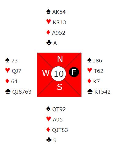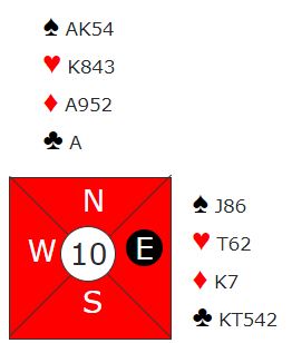 Med Syd (Roar Johansen) som giver ble det åpnet derfra med 1 hjerter.Øyvind Larsen i Vest hoppet innpå med 4 ruter og Ove Gundersen i Nord så ned på jevn hånd med 19 hp. Her måtte noe kraftig gjøres, men hva ville du meldt? Innhoppet varslet jo veldig skjev fordeling imot og går spilltet i hjerter kan det jo godt komme den fargen ut til stjeling i  Øst der Arild Pettersen satt. Derfor ville spill i grand passe bedre enn i hjerter, og dermed smelte Gundersn til med hopp direkte til,6 NT!