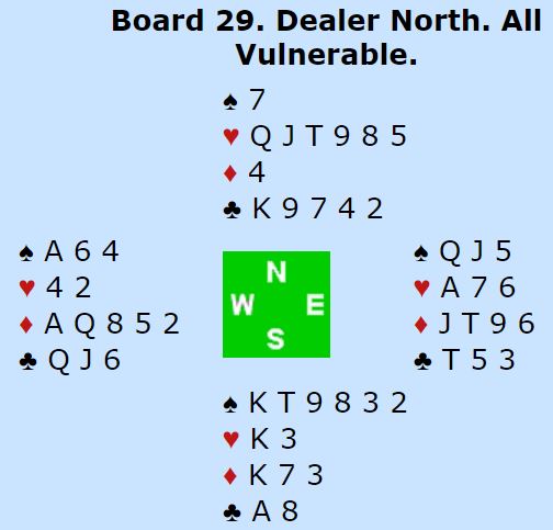 Englands øst svarte 2 kløver. Vest sa 2 ruter som antagelig var en slags hvilemelding, Øst viste hjerterfargen, og vest støttet. Jeg kjenner ikke detaljene i det engelse parets system, men etter den starten endte de i slem.