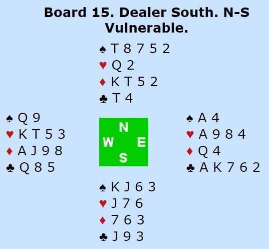 Syd hadde glimrende kort mot nord sine. Det går likevel an å bet 4 hjerter, men da må forsvaret raskt spille to runder trumf. I så fall blir det en taper i hver farge. Hvis ikke syds trumf blir tatt bort godspilles kløverfargen som sitter så snilt med en stjeling. Men å se det det er ikke så lett. Og motspillet ble ikke funnet, så det endte med ti stikk og +790 til Belgia.