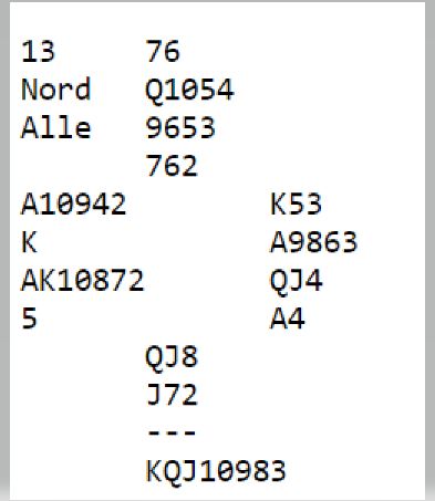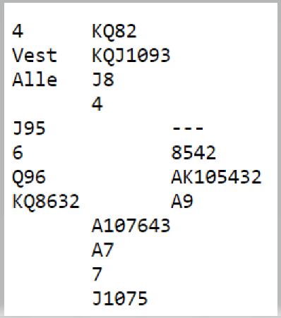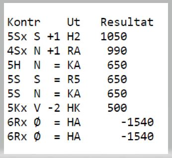Det står i 5 spar N/S. Heimdal BK sitt Ø/V par landet imidlertid i 5 kløver som ble doblet. Det er en mye dårligere kløverkontrakt enn ruterkontrakt, men det står ofte i 5 kløver. Med skjev kløversits skar det seg, to bet og Bergen AK +500.