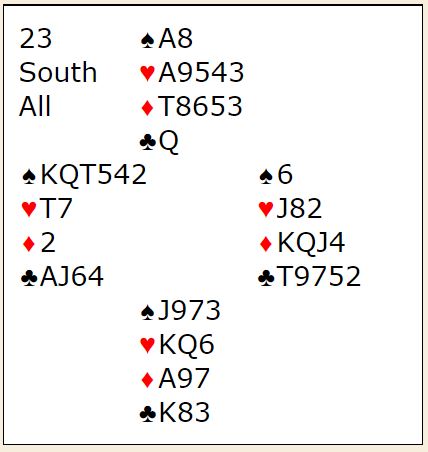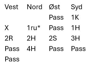 Ved det andre bordet hoppet den norske vest til 3 spar over syds åpning 1 kløver. Jeg vet ikke parets stil, men om 3 spar er sperremelding i systemet deres mener i alle fall jeg at hånden er alt for spillesterk for en slik melding. Men å hoppe innpå setter normalt press på motparten hvis det er de som har kortene, noe som dog kan slå begge veier. Her slo det på en måte galt ut selv om N/S for såvidt gjettet feil.