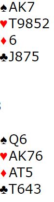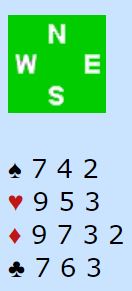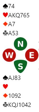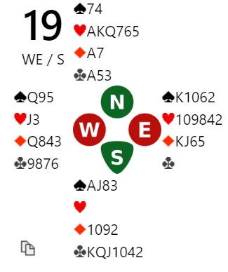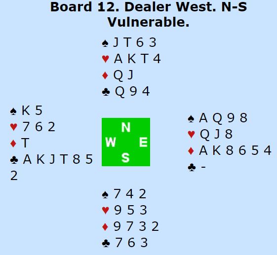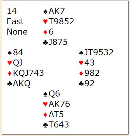 Vest spilte ut spar konge til esset. Så kom ruter fra nord. Med åpne kort ser man at 3NT kan betes. Da må øst gå på med honnør idet ruter spilles fra nord. Øst får i så fall to raske inntak i ruter og kan idet han kommer inn på det første ruterstikket skifte til kløver. Spillefører rekker ikke å få tak i mer enn 1+5+1+1 = 8 stikk. Men øst kan neppe kritiseres veldig for ikke å legge i stor ruter da det godt kan hjelpe spillefører til å løse ruteren best mulig for han. Og øst aner ikke så mye om hvordan resten av kortene ser ut. Så øst la liten ruter, og spillefører vant stikk for ruter 7. Med to ruterstikk i boks behøvde spillefører kun ett kløverstikk for å komme til ni stikk (1+5+2+1=9). Dermed ble det +600 til N/S ved det bordet som sammen med 140 ga 12 IMP ut for det norske laget.