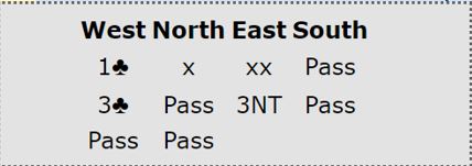 Nord strakk seg til en negativ dobling selv om det var så høyt som over 3 spar, en skummel melding da man "hater" å høre 3NT fra åpneren som jo må melde det selv med helt minimum. Og det skjedde, syd sa 3NT før det gikk pass rundt.