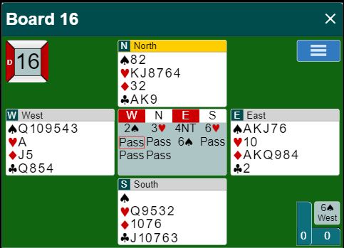 Ved det andre bordet meldte nord 2 kløver i balanseringsposisjonen. Helge Homme (øst) meldte 2 hjerter før N/S endte i 3 kløver som de vant akkurat til tross for den stygge trumfsitsen. Med -110 ved det bordet og +800 fra lagkameratene ga spillet 12 IMP til Norge.