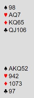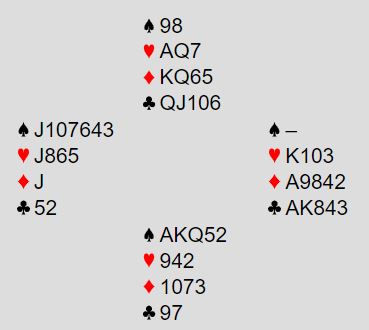 Syd og vest passet før nord åpnet med 1 ruter og øst meldte inn 2 kløver. Syd sa 2 spar, og nord hoppet til 3NT med pass rundt.