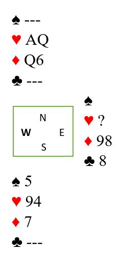 Det kan til forveksling se ut som en posisjon for tosidig skvis, for vest må jo holde sparen. Men det er ikke det, feil tempo, for spillefører har kun to av de fire stikkene. Hvis ruterhonnøren hos nord spilles først, så ruter til tieren blir det tre kort igjen, og vest vil da ha igjen en spar og to hjertere. Så dette blir en skvis mot øst, eventuelt et innspill hvis han hadde gitt opp kløverstikket sitt og holdt to hjertere. Østs gjenværende kort er som en åpen bok. Han sitter nå garantert med en hjerter, to rutere og den godspilte kløveren, men som spørsmålstegnet antyder vet man ikke om øst har gått ned på singel hjerter konge eller sitter igjen med en mindre hjerter. Hva ville du gjort nå? Toppe hjerteren som er rett om spørsmålstegnet innebærer hjerter konge, eller ta finessen som er løsningen hvis vest har det kortet?