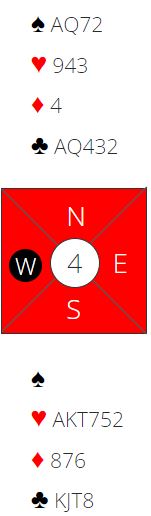 Dette er et slikt spill som mange omtaler som "en bør spille 5 kløver eller 7 kløver". Ingen vits i å spille 6 kløver da det er enten 11 eller 13 stikk. Det er nok ikke helt riktig, for det kan jo komme en annen farge i utspill. I så fall er det tolv enkle stikk. Så å spille 6 kløver er fint nok, en 50% sjanse med ruter ut, 100% med annet utspill. Men hvordan komme dit?