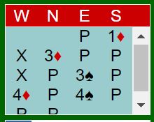 Ved det andre bordet satt Geir Brekka syd og Øyvind Saur nord. Også der doblet vest syds åpning 1 ruter. Brekka-Saur spiller med ekte 1 ruteråpning. Derfor kunne Saur hoppe til 3 ruter med nords kort - sperremelding. Det satte mer press på Ø/V. Det gikk pass, pass før vest doblet igjen. Da sa øst 3 spar, og de endte i 4 spar etter dette meldingsforløpet: