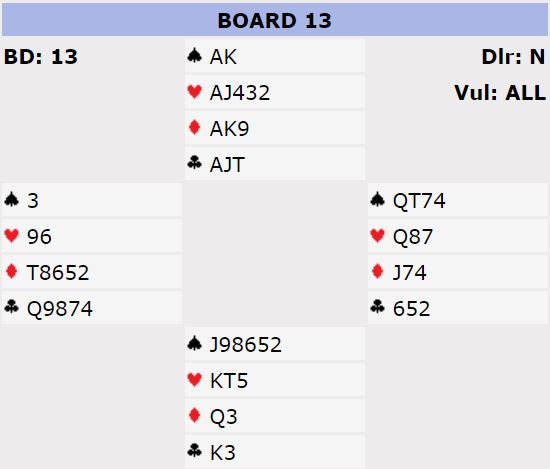 I 6S har man den fordelen at en hjerter kan kastes fra syd på ruter, så et eventuelt hjertervalg behøves ikke. På den annen side er 6S sårbart og går ofte bet om en motstander har fire spar da det som regel gir to spartapere. Kontrakten 6H er veldig bra, den kan godt stå selv om det blir en hjertertaper. Også i 6NT er det svært gode muligheter. Først kan hjerteren løse seg, og i så fall blir det tolv eller tretten stikk i NT. Om det bommes i hjerter er det to andre sjanser, spar dame kan sitte singel eller dobbel, eller en kan til slutt prøve kløverfinessen. Det er også skvismuligheteri NT kontrakt om det blir en hjertertaper, men da må det gjettes på sitsen.