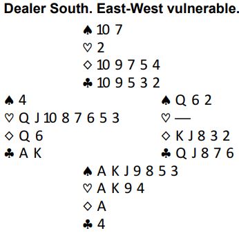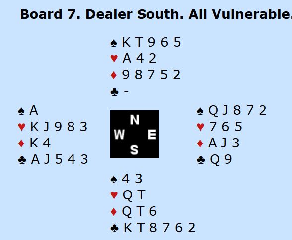 Makker hadde jo noen verdier til deg selv uten honnørpoeng med en singelton og to trumf. Men hvis du spiller rett etter nesen og denger ned hjerter ess går det galt hvis det sitter slik fra start, en ganske sannsynlig sits slik meldingene har gått: