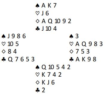 Etter å ha startet med A-K i spar ble det helt feil i denne utgangen som fra start så ut som ville kunne ende med ett overstikk. En desperat spillefører fortsatte med ruter fra topp i håp om at vest fulgte farge lenge slik at ruteren kunne gi avkast. Men vest kunne trumfe allerede i tredje runde ruter og spilte seg fri med spar knekt. Dermed var spillefører låst på hånden og fikk to hjertertapere – to bet!