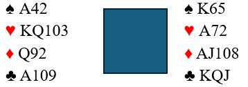 Opptelling: Det er fem toppstikk i de svarte fargene. Både hjerter og ruter kan gi fire stikk, men det kan også bli kun tre stikk i begge de fargene. Med minmum uttelling i de røde fargene blir det 2+3+3+3=11 stikk, en bet.