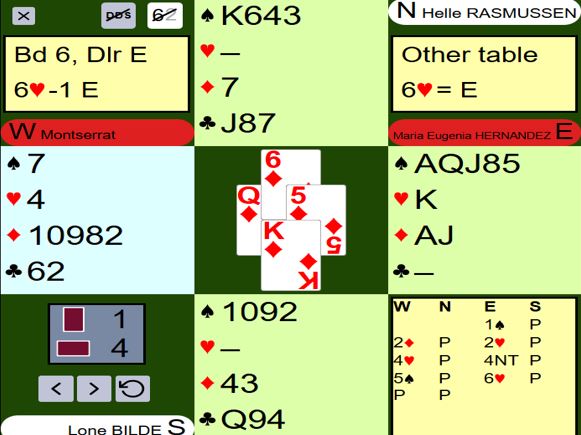Det er flere måter å vinne 6 hjerter på slik det sitter, men spillefører må være litt forsiktig. Gunn Tove Vist (lag NORDEN) stakk utspillet med kløver ess og stjal en kløver. Så tok hun runder trumf, men lot nord beholde en trumf fordi hun ønsket å trumfe en kløver til med håndens siste trumf. Vests siste kløver ble trumfet før hun ga hun bort ruterstikk med liten ruter fra øst. Da hadde hun full kontroll, det eneste faremoment var 4-1 sits i ruter. Hvis syd legger liten ruter vinner nieren stikk hos vest, så ut med trumfen, og N/S får kun ett stikk i ruter. Norden +1430.