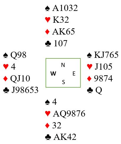 Selv om spillefører tar en trumfrunde først før det spilles A-K i kløver går det galt. Øst trumfer den andre kløverhonnøren og spiller (best) trumf. Øst har fortsatt igjen en trumf. Om den tas ut blir det kun en trumf igjen hos nord, og kun en kløver kan trumfes. Syd blir hengende med en kløvertaper. Det går det simpelthen ikke å bli kvitt begge de to små kløverne etter en slik start hvor øst får trumfet en av kløverhonnørene.