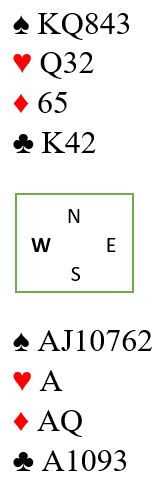 Syd skal spille 6 spar uten at motparten har meldt. I meldingsforløpet sniffet N/S litt på storeslem, men de holdt seg klokelig unna det, for som du ser er det egentlig to mulige tapere, en i hver minorfarge.